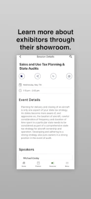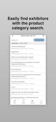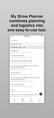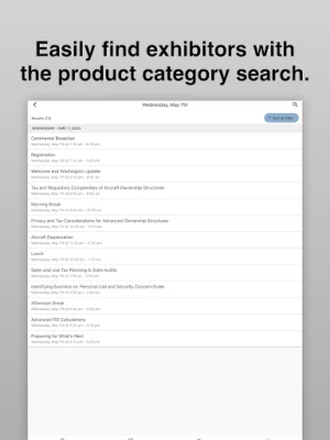 The free 2025 NBAA Business Aviation Taxes Seminar App includes a full schedule of sessions and official events, the ability to browse sessions and speakers, or search by keyword, and general show information.